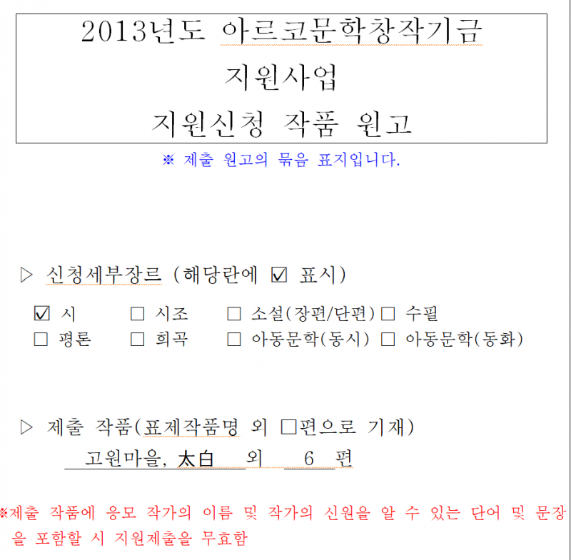 2010년 12월, ‘상징화된 상상계’, 고향 태백(太白)을 존재 전체의 고향으로 상정. “흰”을 핵심적 이미지로 설정하고, “흰”으로의 귀향을 형상화한 시편 5편을 완성한다. 다음 해 아르코에 응모했지만 떨어진다. 아마 작품을 보지않고 태백(太白)을 단순히 어느 탄광촌 작은 마을을 묘사한 것으로 착각한 결과라는 생각을 한다.